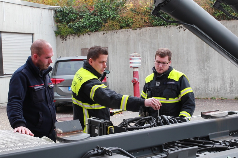 Für Kevin ist das aber nur der erste Schritt in der Ausbildung auf dem neuen Einsatzfahrzeug. Vor ihm liegen noch mehrere Stunden Einweisung und Fahrpraxis. „Vor einigen Jahren habe ich den Lkw-Führerschein gemacht und die sogenannte Maschinistenausbildung absolviert“, erklärt der 31 Jährige. „Mit dieser Qualifikation durfte ich die beiden Löschgruppenfahrzeuge unserer Abteilung fahren und bedienen. Weiter ging es dann mit der Ausbildung zum Drehleitermaschinisten. Das war nochmal eine ganz eigene Herausforderung und nun kommt das Wechselladerfahrzeug, was besonders wegen seiner Größe, dem Gewicht und der Technik sehr spannend ist.“