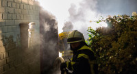 Dichter Kunstnebel dringt aus einem Haus in dem die Feuerwehr übt.